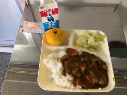 今日の給食は牛乳、ポークカレーライス、キャベツのサラダ、みかんです。いただきます!!