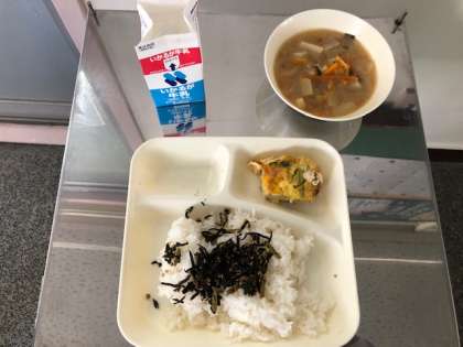 今日の給食はごはん、牛乳、千草焼き、みそ汁、ごまひじきです。いただきます!!