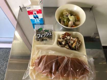 今日の給食はパン、牛乳、鶏肉とじゃがいものスープ煮、きのこのドリア、ミニフィッシュです。いただきます!!