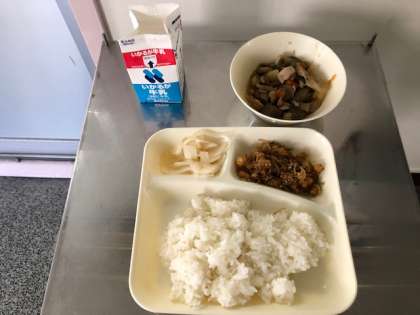 今日の給食はごはん、牛乳、鶏肉と野菜の煮物、じゃこ豆、かぶのゆず風味です。いただきます!