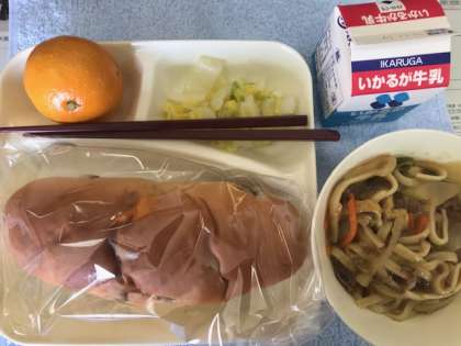 今日の給食はパン、牛乳、カレーうどん、はくさいの甘酢あえ、みかんです。 今週もごちそうさまでした。