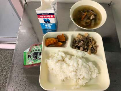今日の給食はごはん、牛乳、豚肉と干しずいきのみそ煮、すまし汁、やきかぼちゃ、ソフト黒豆です。いただきます!!