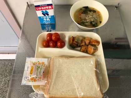 今日の給食はパン、牛乳、さけのマリネ、肉だんごと麦のスープ、プチトマト、アプリコットジャムです。いただきます。