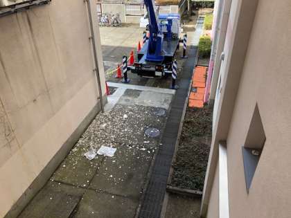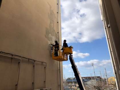 先週の台風並みの強風によって剥がれた校舎の外壁を緊急工事しています。