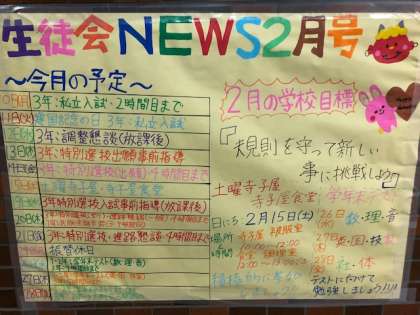 玄関を入ると生徒会newsが2月号に変わっていました。毎回月毎の予定やイラストなど、時間をかけて作ってくれています。皆さん見てください。