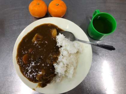 最後はサッカー部が食べに来ました。今回のメニューはカレーライスとみかんでした。