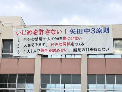 矢田中学校では2018年にいじめ三原則を生徒会主体で作成し、中庭に大きな横断幕を設置し日々呼びかけています。