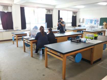3年生は今週の月曜日から生徒1人ひとりと進路・教育相談で休校中の学習面や生活面の話を行っています。その後、簡易マスクの作成を動画をみながら行いました。月曜日に引き続き、今日も取組の取材がきていました。