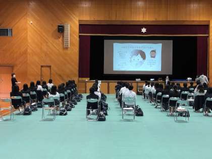正門で検温・健康チェックを行い、体育館で前後左右1m離した席で新型コロナウィルス感染症や感染予防についての講義を養護教諭よります受けました。