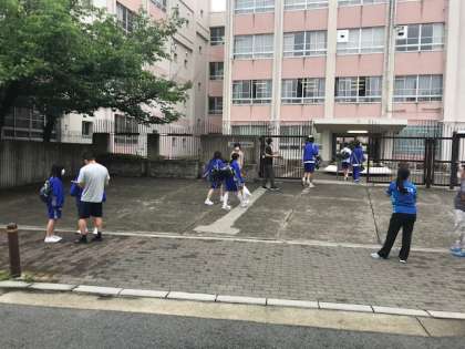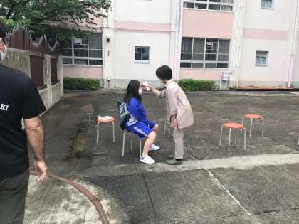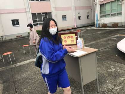 まず、正門で検温チェックやアルコール消毒や手洗いなどを行い、取組をスタートさせます。写真は2年生の登校風景です。