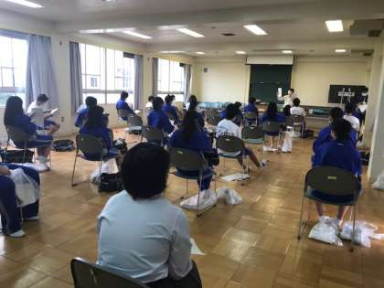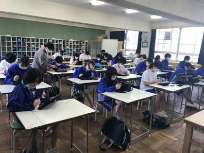 3年生は学級の教室より広い部屋を使用し、隣との間隔を確保し、学級開きやネット学習の進め方の取組を行っていました。