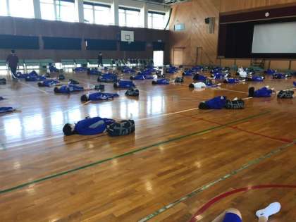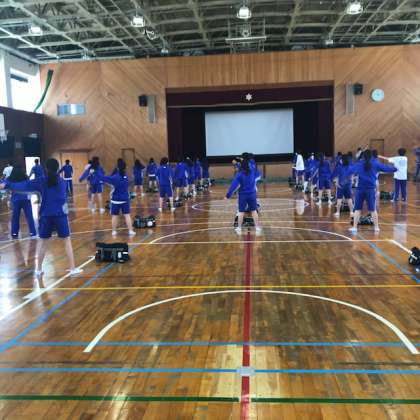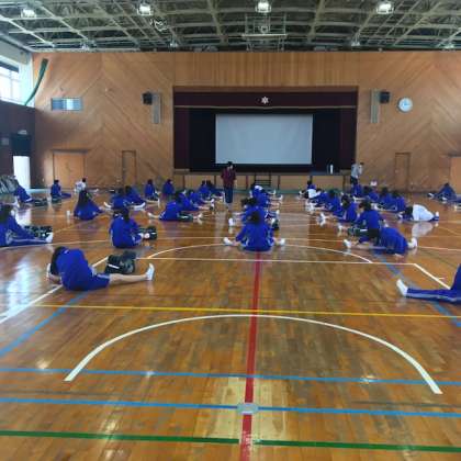 2年生は最後に体育館いっぱいに広がって、ストレッチや体操などで体を少し動かし、ほぐす運動をおこないました。