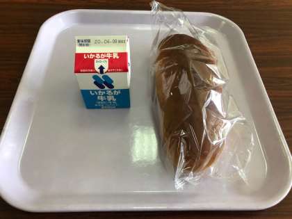 今日の給食です。黒糖パン、牛乳。いただきます。