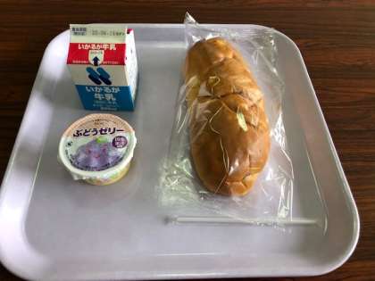 今日の給食はおさつパン、牛乳、ぶどうゼリーです。
