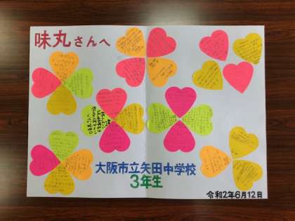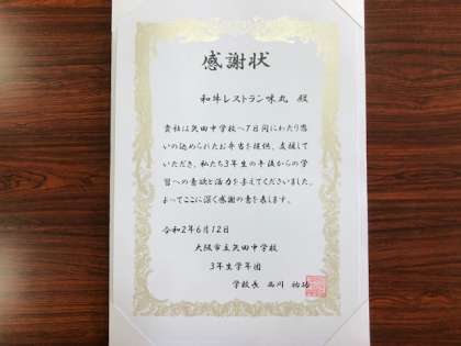 2週間の分散登校期間中、午後からの個別対応や家庭へ支援として、毎日、昼のお弁当を希望者に無償で提供していただ「味丸」さんに3年生が感謝状を作成しました。