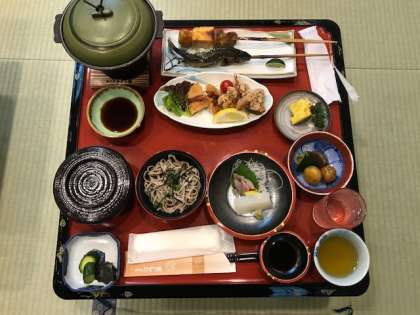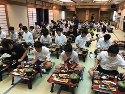 夕食です。全員前向きですが、普段では食べれない四国の料理など味わってください。