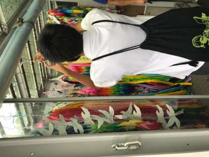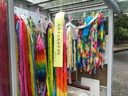 平和記念館での式典です。矢田中学校で作った鶴を供えます。
