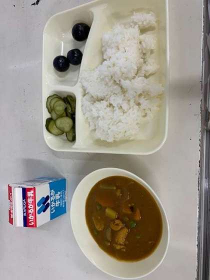 昨日の給食は、チキンカレーライス、キュウリ、ブドウでした。