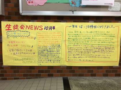 玄関に生徒会newsの10月号が掲示されています。一泊移住や修学旅行の感想など立ち止まって読んでみてください。