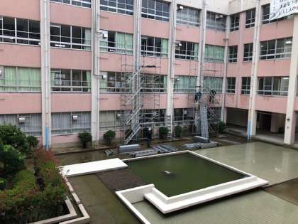 今日は冷たい雨でしたが、11月中旬までいくつかの特別教室の空調機の取り換え工事が始まりました。生徒の皆さんがより快適に学校生活を送れるよう少しの間、足場や音などで迷惑をかけます。