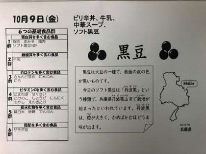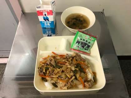 今日の給食です。ピリ辛丼?いただきます。今週もごちそうさまでした。