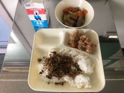 今日の給食です。おかか菜っ葉とご飯は合いそうですね、いただきます。
