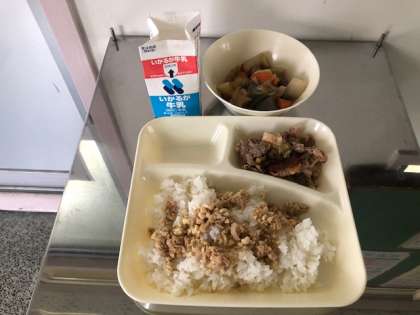 今日の給食です。いただきます。今日は給食を食べて下校となります。午後から有効に時間を使ってください。