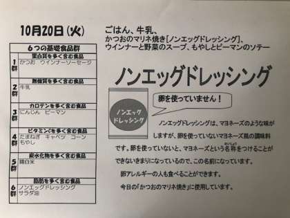 今日の給食です。カツオのマリネは珍しいメニューでした。ごちそうさまでした。
