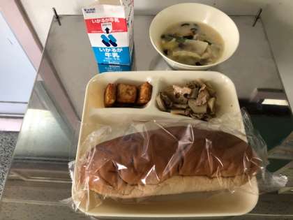 今日の給食です。最近、黒糖パンの出番が多いですね。いただきます。