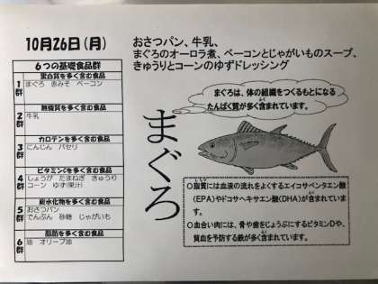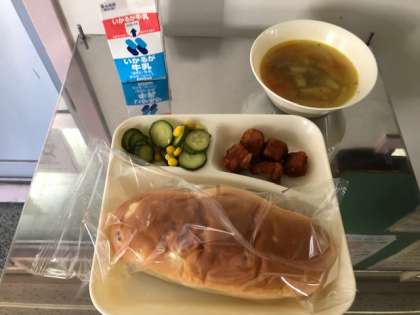 今日の給食です。良い天気なので朝晩の気温差が大きくなっています。服装で調節しながら、栄養もつけて体調を崩さないようにしてください。いただきます。