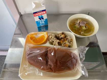 今日の給食です。パンと牛乳の残食率が高くなっているため、しっかり食べましょう。いただきます。