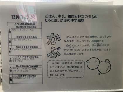 ご飯、鶏肉と野菜の煮物、じゃこ豆、カブ、牛乳でした。