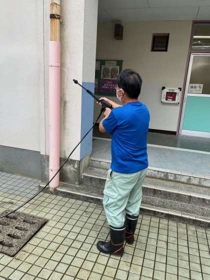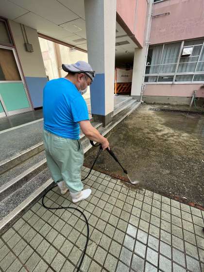 管理作業員さんが中庭まわりのタイルや校舎の外壁の頑固な汚れを高圧洗浄機を使って、清掃作業をしてくれました。