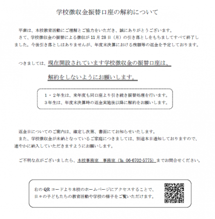 つきましては、現在開設されています学校徴収金の振替口座は、解約しないようにお願いします。