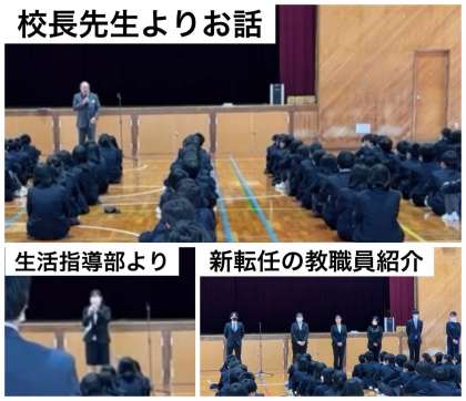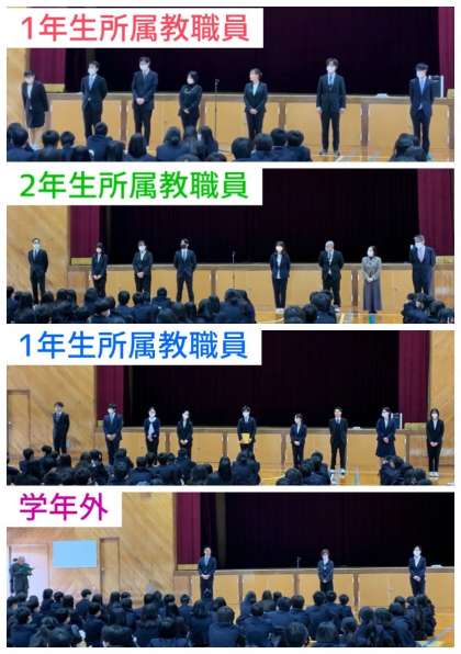 まず、校長先生からのお話、生活指導部からの諸注意の後、それぞれの学年の教職員紹介がありました。