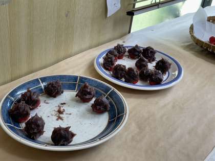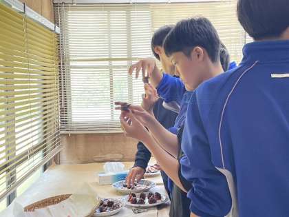 2つの班が合同で苺大福を作っています!みんな真剣に楽しくあんこを包んでいます!