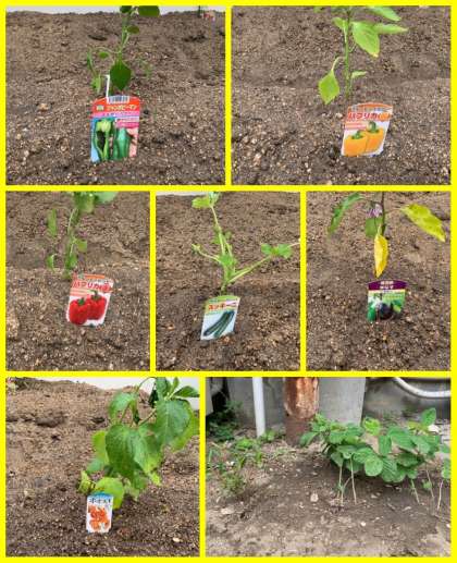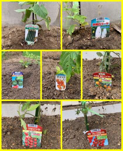 今年は、きゅうり、白ゴーヤ、小玉スイカ、黄ミニトマト、ミニトマト、フルーツ中玉トマト、さつまいも、じゃがいも、ジャンボピーマン、黄パプリカ、赤パプリカ、ズッキーニ、米なす、ホオズキ、苗屋さんがおまけでくれた何かわからない苗2つの合計16種類の苗を植えました。