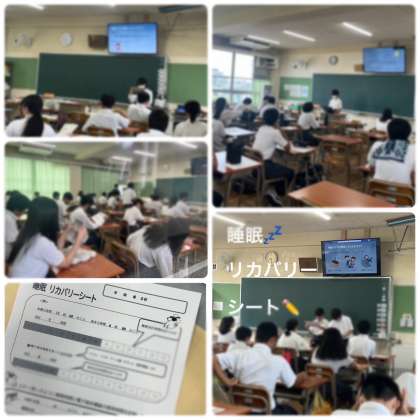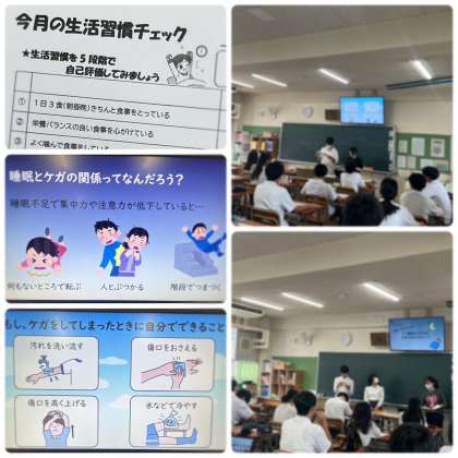 保健美化委員が資料を使って、睡眠とケガの関係などの発表をしてくれました。今月の保健目標は、自分でできる応急手当てを覚えようです。