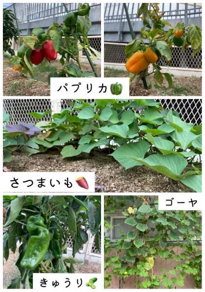 やっときゅうりが大きくなり、パプリカも色づいてきました。白ゴーヤも大きな実をいくつもつけるようになりました。