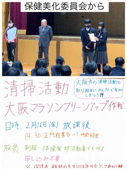 最後に、保健美化委員会から、大阪マラソンクリーンアップ作戦についてのお知らせがありました。