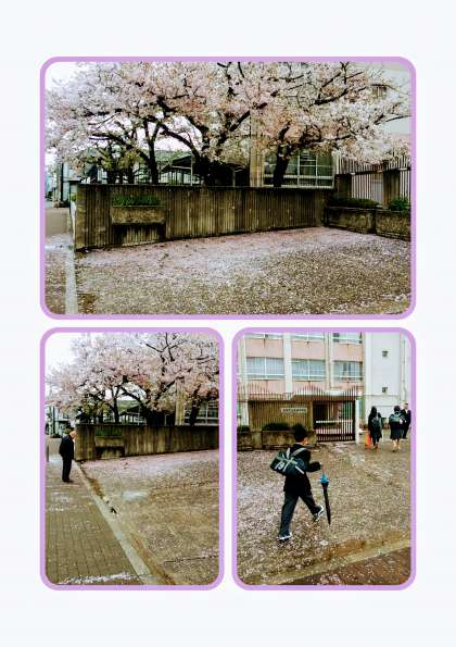 昨夜からの雨で、正門の桜もサクラ色のカーペットのようなになりました。