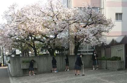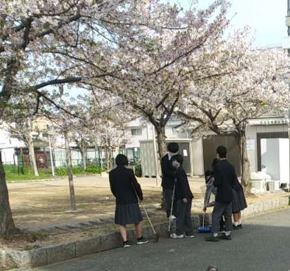4月11日(木)、正門前のサクラの清掃を生徒会役員とバレーボール部員たちが綺麗に清掃してくれていました。