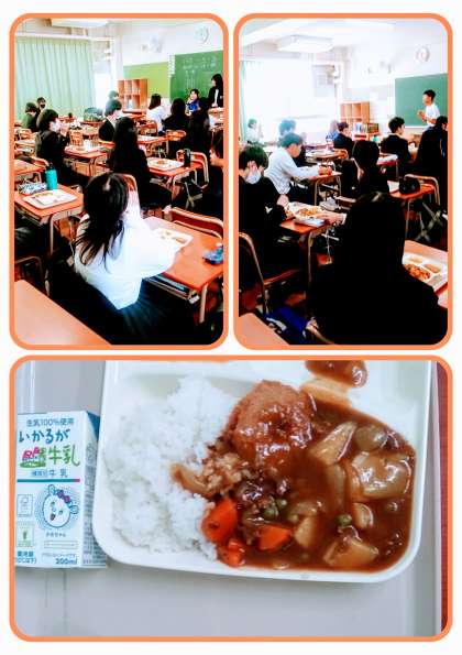 4月12日(金)、今日の献立は、カツカレーライス、フルーツゼリー「みかんゼリーと和なし(缶)を混ぜ合わせた彩りのよいデザート」、牛乳です。『1年生の入学と2・3年生の進級おめでとう!』ということの【祝い献立】です。