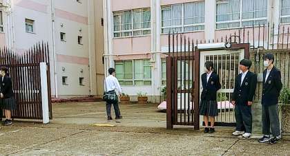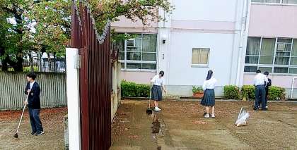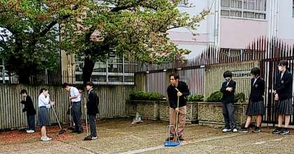 4月17日(水)、生徒会役員のあいさつ活動とバドミントン部の清掃活動の様子です。サクラの房の清掃が大変です。
