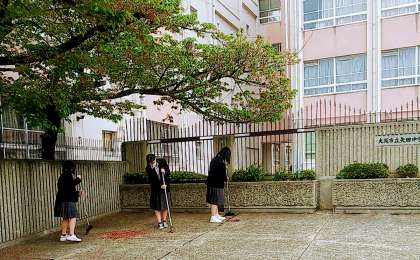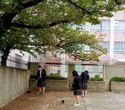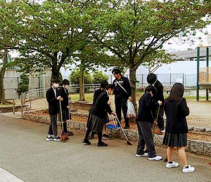 4月18日(木)、バレー部と生徒会役員の生徒たちが一緒に正門前を清掃していました。