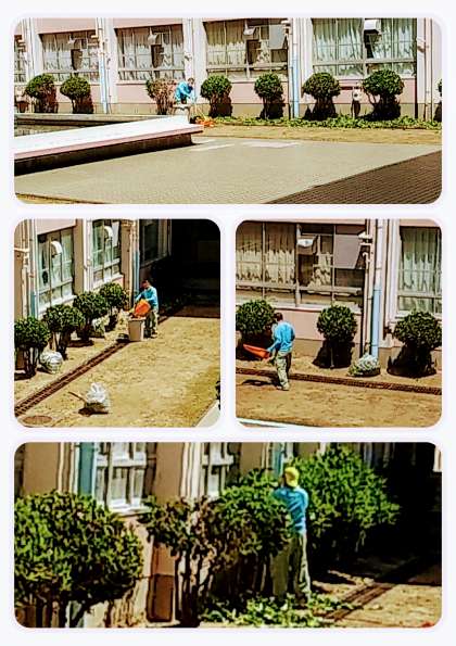4月19日(金)、昼頃、管理作業員さんが中庭の木々の剪定をされ、黙々と後片付けも綺麗にされていました。