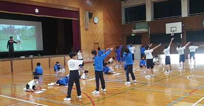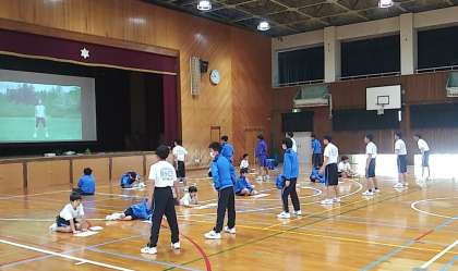 4月19日(金)、男子の保健体育は、体育館にて、二人一組でラジオ体操をするものとそれをチェックするものに分かれて活動していました。女子は、格技室で、隊列変換をやっていました。