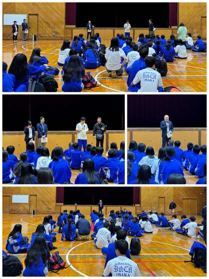 体育館で、校長先生のあいさつ、名鉄観光業者添乗員さんと写真屋さんの紹介、生徒代表あいさつがありました。