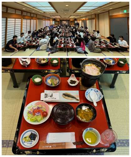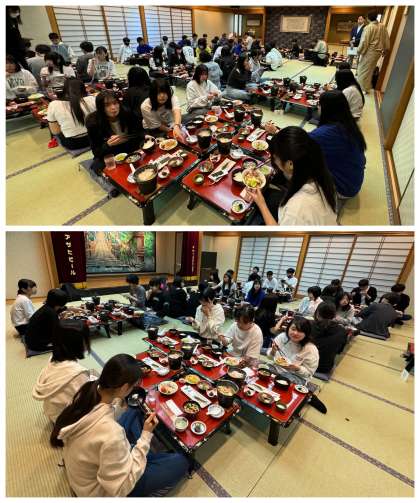 5月14日(火)7:00、修学旅行最終日の朝食はホテルの豪華なお膳です。「海苔うまー」「鍋あったかい」など朝早くてもご飯をおかわりしてもりもり食べています。