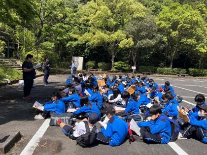 今からキャンプ場にて飯盒炊飯をします。 みんなで協力してカレー作りです。 担当の教員より説明を受けています。